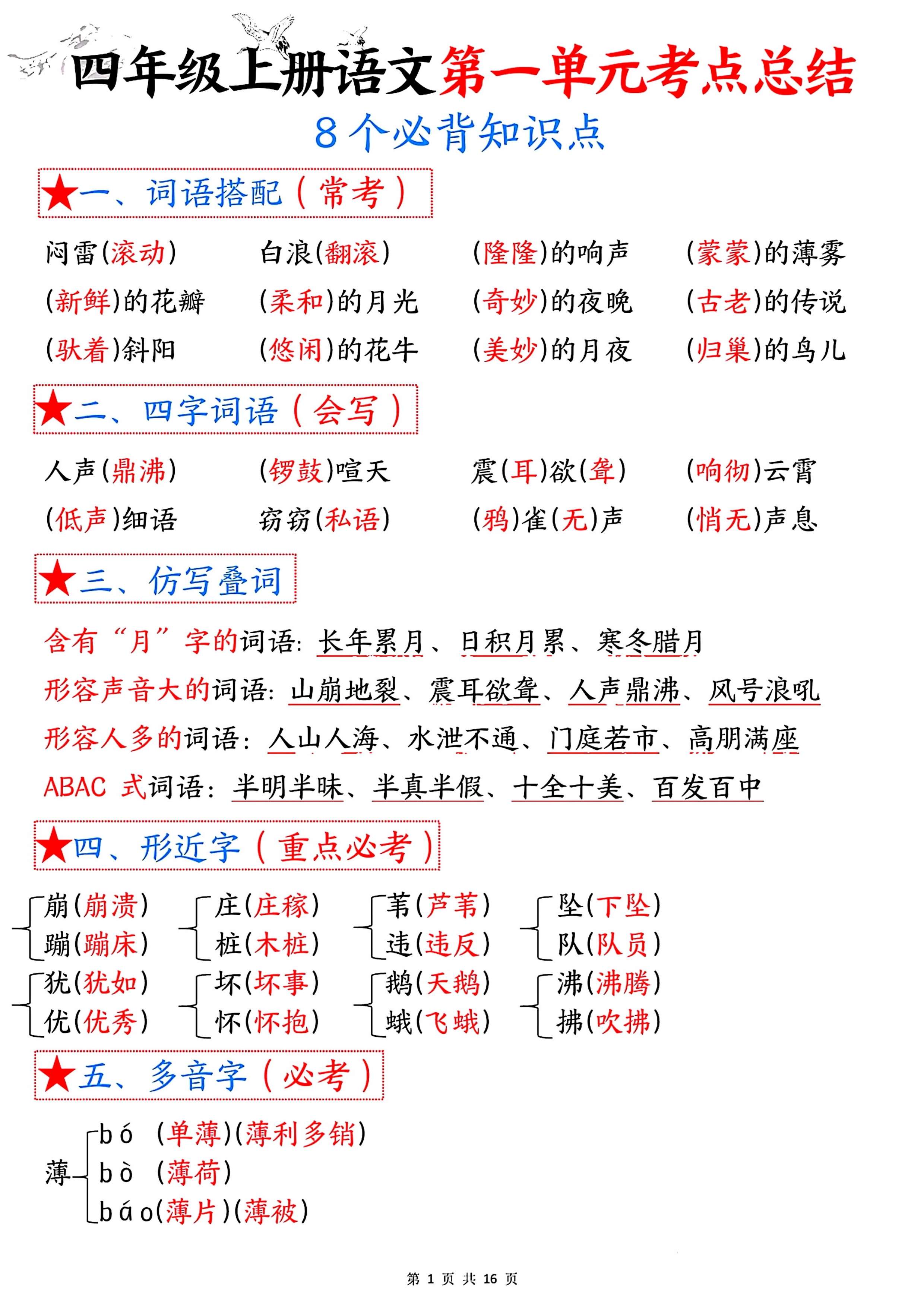 四年级语文上册1-8单元考点总结:8个必背知识点全搞定!