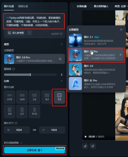 这里要注意,选择一个适合你需求的模型,特别是2.0版本的升级版,它能生成更细腻的图片,尤其适合毛绒玩具这种细节丰富的产品。模型选好后,接下来选择图片的比例。