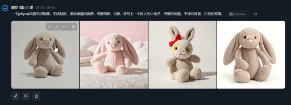每张图片都根据你的提示词进行调整,毛绒感十足,细节也非常到位。你会发现,图片中的玩偶不仅外形可爱,材质感也非常真实。