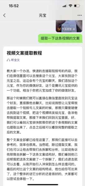 使用起来也很方便,比如你刷到一条视频号内容,想提取文案,只需要把这个视频转发给元宝,并在对话框里告诉它“帮我提取文案”,它很快就会自动识别视频内容,并把完整的文字内容发给你。
