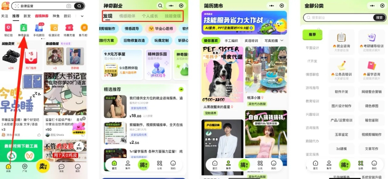 先说“神奇副业”这块,你点开闲鱼顶部的这个入口,能发现一堆想不到的赚钱法子。