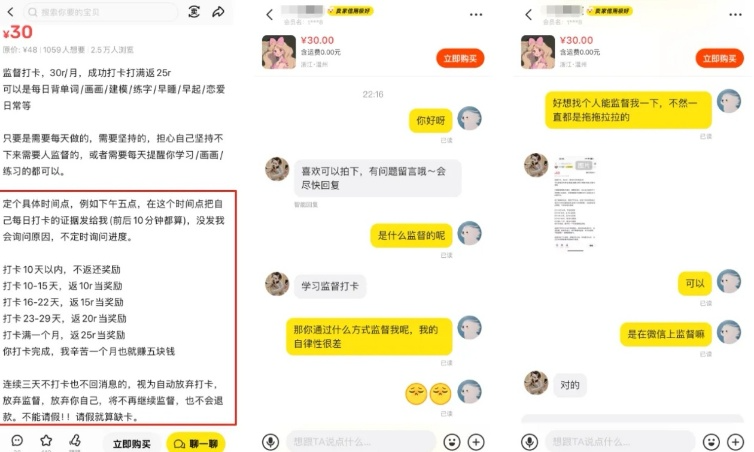 有群友假装客户去问一个“监督学习”的卖家,发现他收30块钱一个月,打卡25天退25块,说白了就是靠“没坚持下来的人”赚钱,全程微信沟通,定时提醒,操作不复杂。