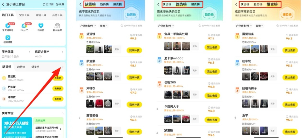 再看闲鱼的榜单,打开鱼小铺工作台,里面的缺货、趋势、爆卖榜单,简直是选品指南针。