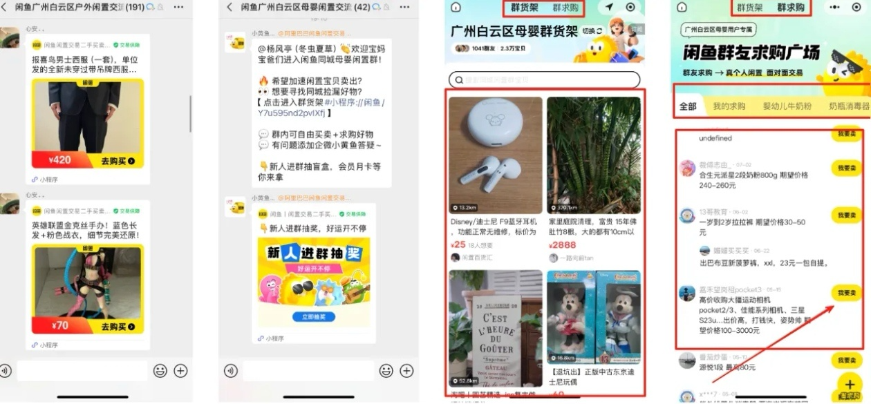 加了几个,发现群里不光有人卖货,还有“群求购”板块,全是活生生的需求——有人要旧家具,有人找宠物用品,你要是有对应的货,直接点“我要卖”就能对接。