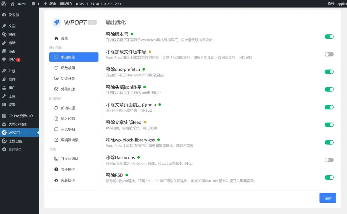 WPOPT插件,是由lovestu开发的一款WordPress优化插件,能对WordPress底层功能进行优化,支持功能开关,系统加速等功能。