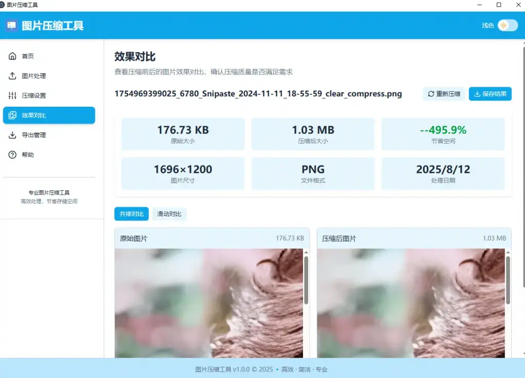 这工具的压缩效果也是一绝。我试了试,拿同一张图片来说,LocalSqueeze能把它压缩到104KB,而其他工具,比如TinyPNG,压缩后得175KB。关键是,压缩后的图片质量一点不打折扣,肉眼几乎看不出差别。这效率,这效果,简直绝了!