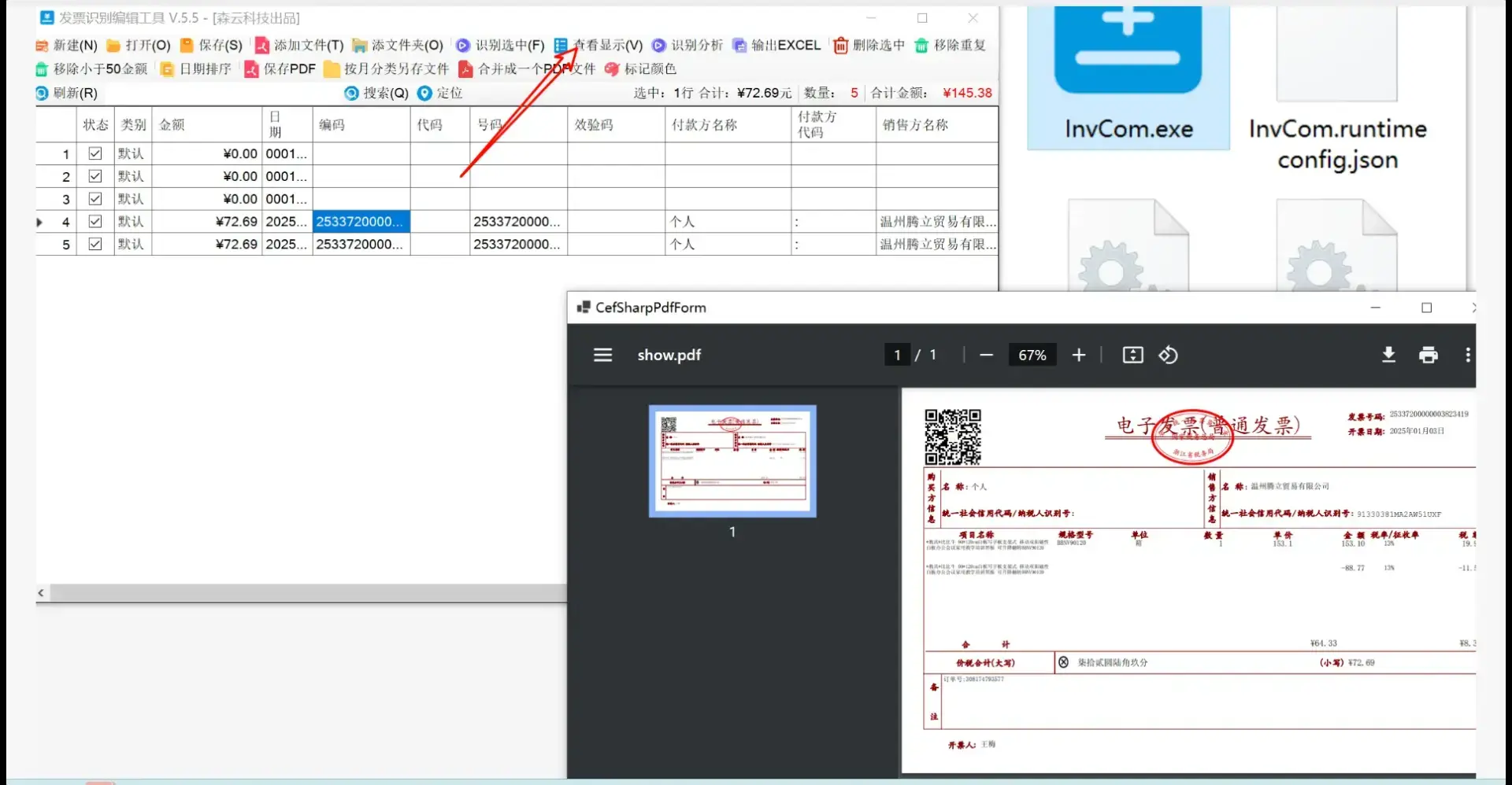 这个软件叫 InvCom发票PDF文件识别工具,它是个绿色免安装版,下载之后直接点开就能用,很方便。