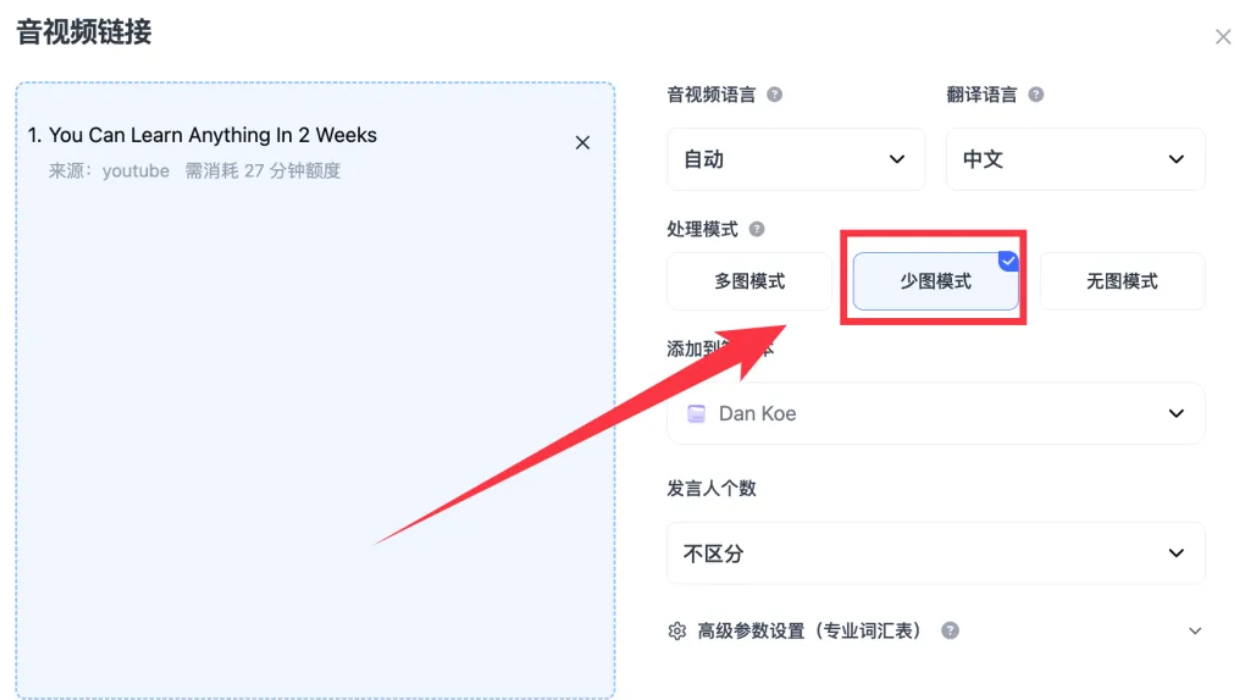 接着用Ai好记解析内容,打开官网后上传选好的视频链接,然后选择“少图解析模式”,这种模式更方便后续截图。解析完成后,界面左侧会有思维导图大纲和AI总结的重点,右侧是能双语翻译的沉浸式阅读区,要是想提高效率,一次上传10个文件批量生成笔记也可以。